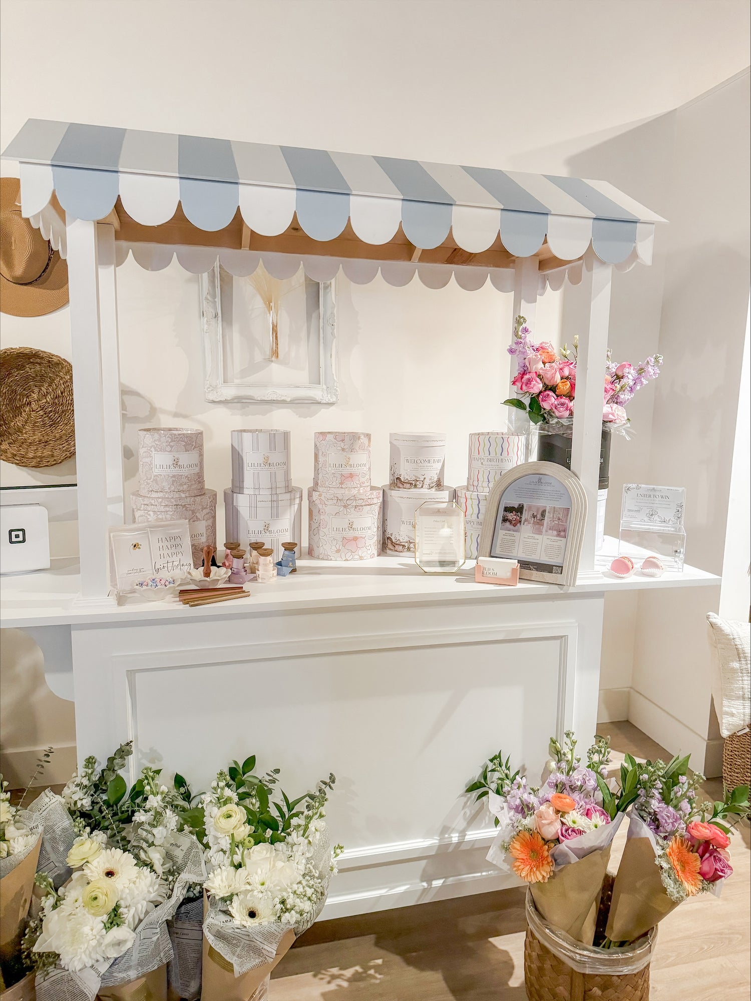 Introducing our charming floral cart, a versatile addition to any event! This elegant white cart features a striped light blue and white awning, adding a touch of whimsy and sophistication to any setting. Perfect for bridal showers, baby showers, birthdays, corporate events, vendor expos, and more, our floral cart brings a unique and delightful element to your special occasion.